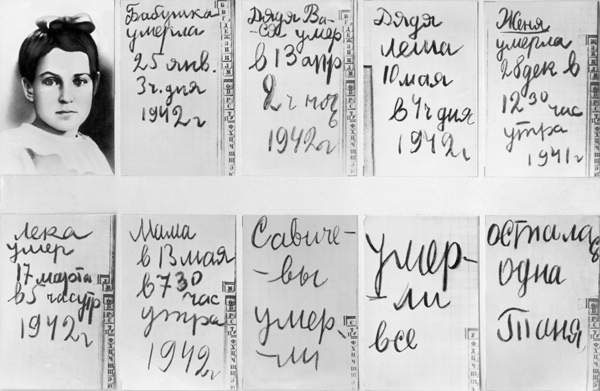 История Тани Савичевой – ленинградской школьницы, погибшей от последствий блокады, стала известна многим россиянам, благодаря ее дневнику с датами смерти близких родственников. В её дневнике девять страниц, на шести из которых даты смерти близких людей - матери, бабушки, сестры, брата и двух дядей. Сама Таня умерла уже в эвакуации 1 июля 1944 года в возрасте 14 лет. В медицинской карточке было записано: «Цинга, дистрофия, сильное нервное истощение, слепота…» Дневник Тани Савичевой был предъявлен на Нюрнбергском процессе в качестве доказательства преступлений фашизма. Девочка пережила блокаду, но так и не узнала о долгожданной Победе 9 мая 1945 года...